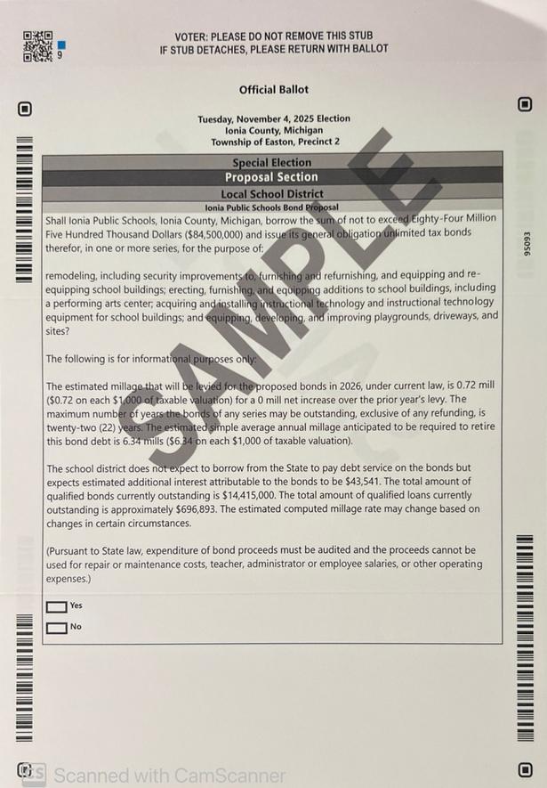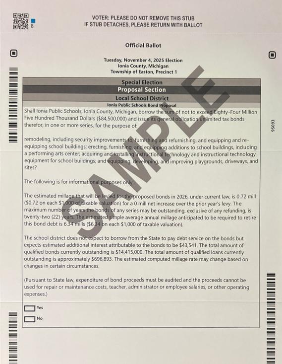 VOTING: The Special Election on November 4, 2025, is for an Ionia Public Schools Bond Proposal. Polls will be open from 7 AM to 8 PM at the Easton Township Hall at 720 N Bellamy Road for residents who wish to vote in person.